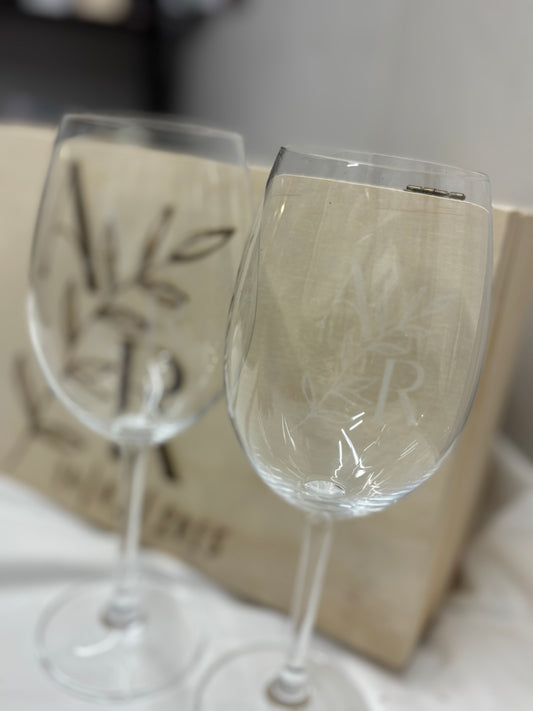 Copas de vino personalizadas más caja de madera