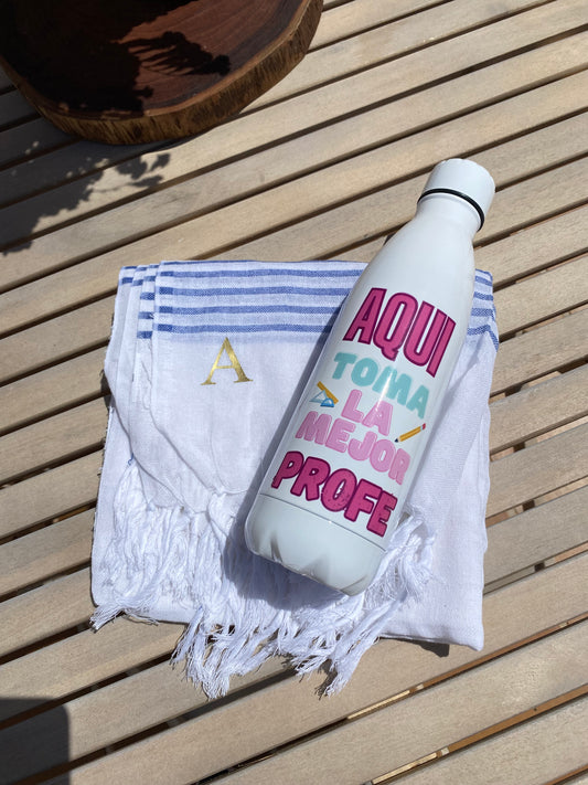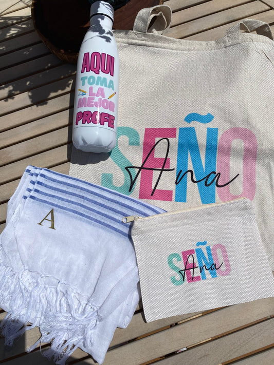 Pack regalo personalizado para profesora – tote bag, neceser, joyero, pareo, botella y más