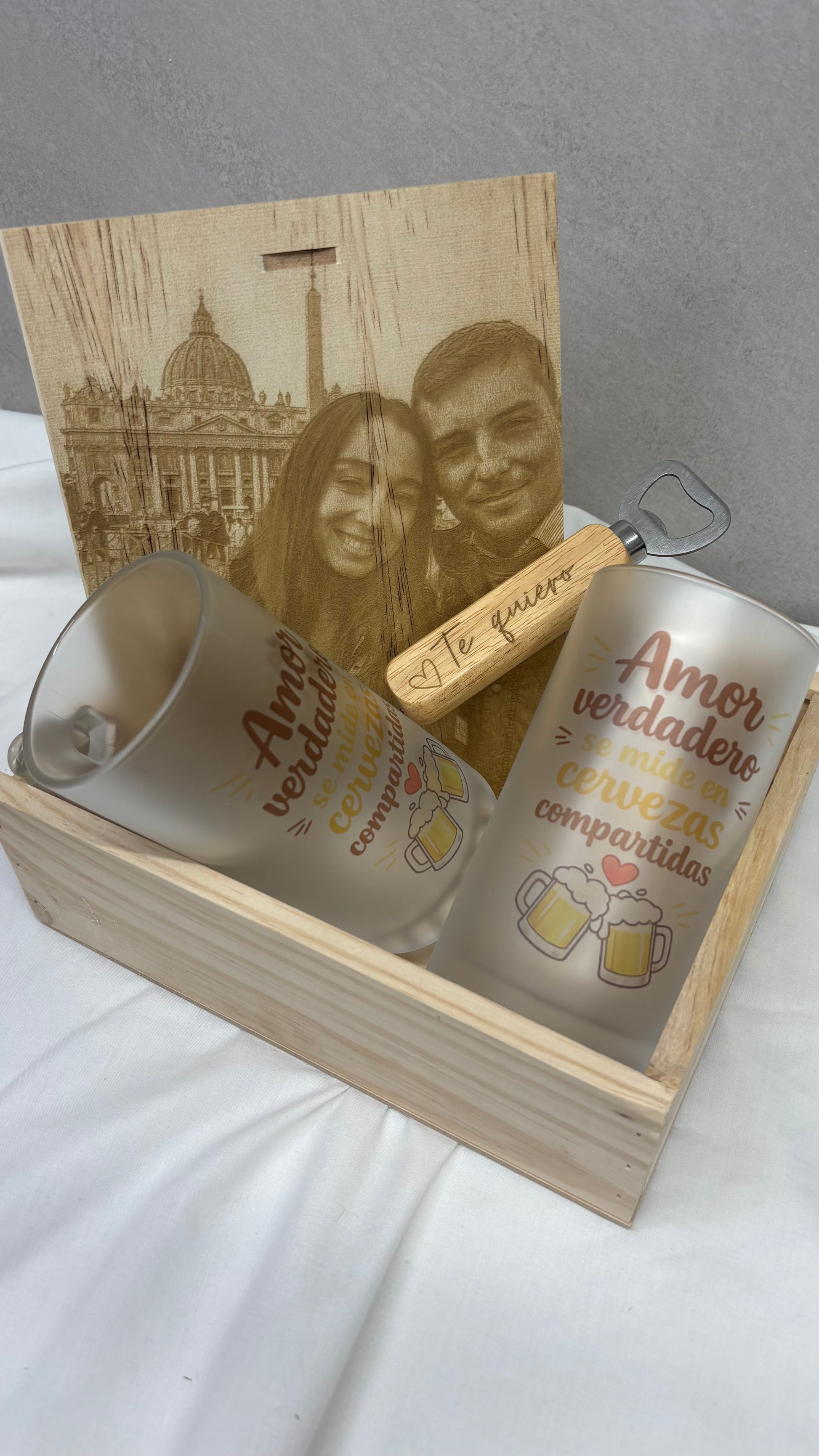 Caja grabada con foto jarras de cerveza y abridor