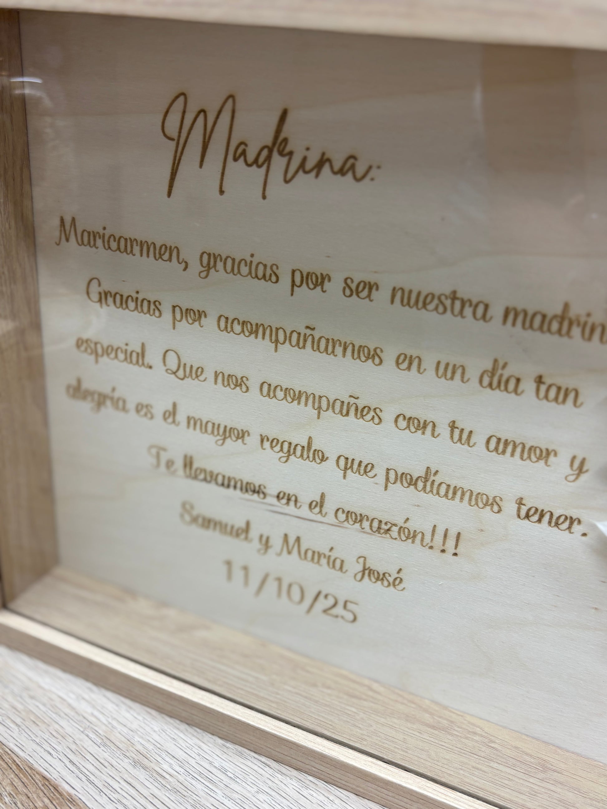 Personalización completa: puedes elegir el nombre, frase o dedicatoria que aparecerá en la pieza de madera.
