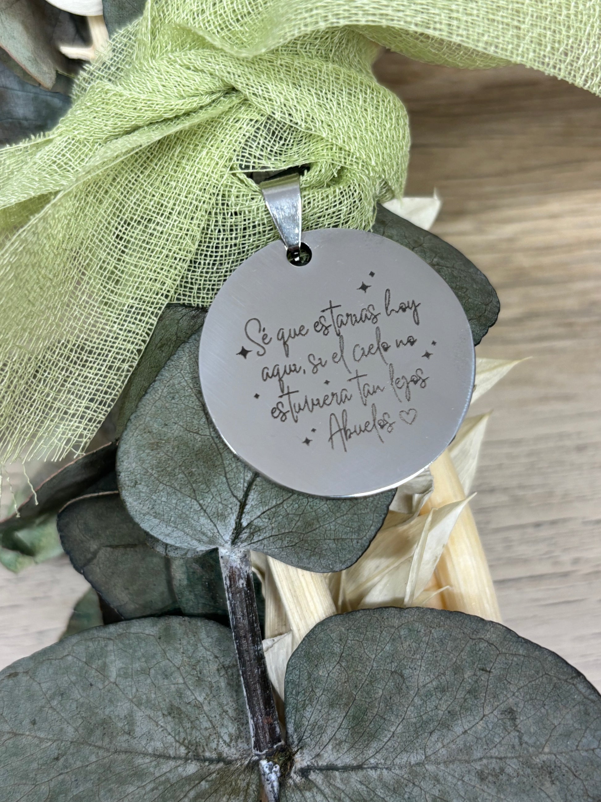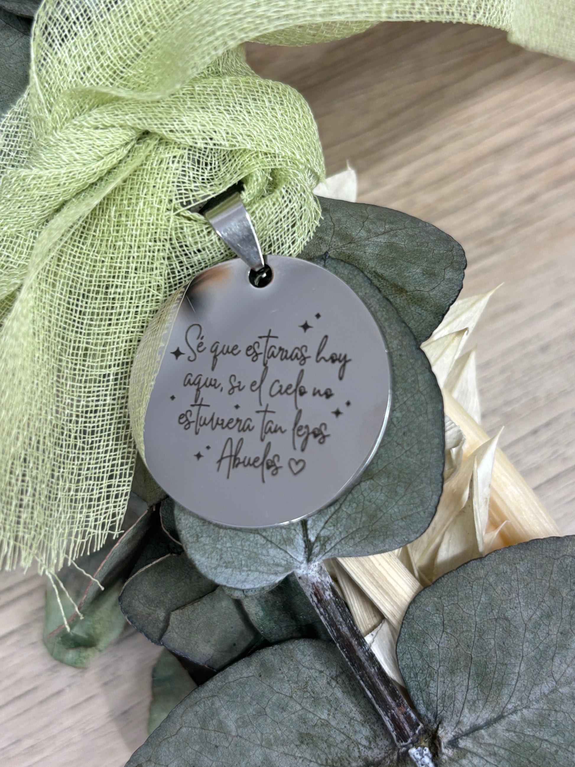 Fabricada con materiales de calidad, esta medalla se personaliza al instante, llevando en su diseño ese mensaje que habla al corazón. Perfecta para agarrar al ramo y convertirlo en un detalle cargado de emoción, ideal para novias que quieren llevar consigo recuerdos llenos de significado.